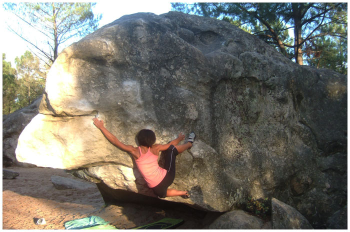 À Hultehouse je fais Trav'ail le 7b avec la longue traversée mais surtout je fais grimper ma maman. Ce site est super joli avec des blocs faciles mais super hauts (pas le droit de tomber).