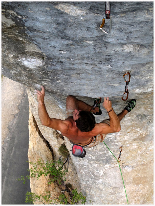 Le lendemain rebelotte je m'échauffe tranquillement puis je fait à nouveau trois voies à vue, Le serpent à sornettes (7c), Les mutins de Panurge (7c) et Les cloches de Baal (8a). Ensuite j'essaye Délice Paloma (8a+) une voie atypique avec un grand mouv' au debut dans le toit. Je finis par trouver une méthode en double jeté qui me permet de la faire au troisieme essai. Fin de journée avec L'hydre aux pattes un 7b+ dans lequel il m'a fallu beaucoup d'essais pour faire ce jeté vraiment dur.