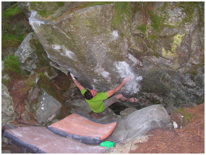 Il s'agit de la première répétion connue de cette voie ultra bloc, sur petis monos, libérée par Julius Westphal en 2005. Ce petit pan de rocher très déversant aura résisté à tous les assauts pendant près de huit années.